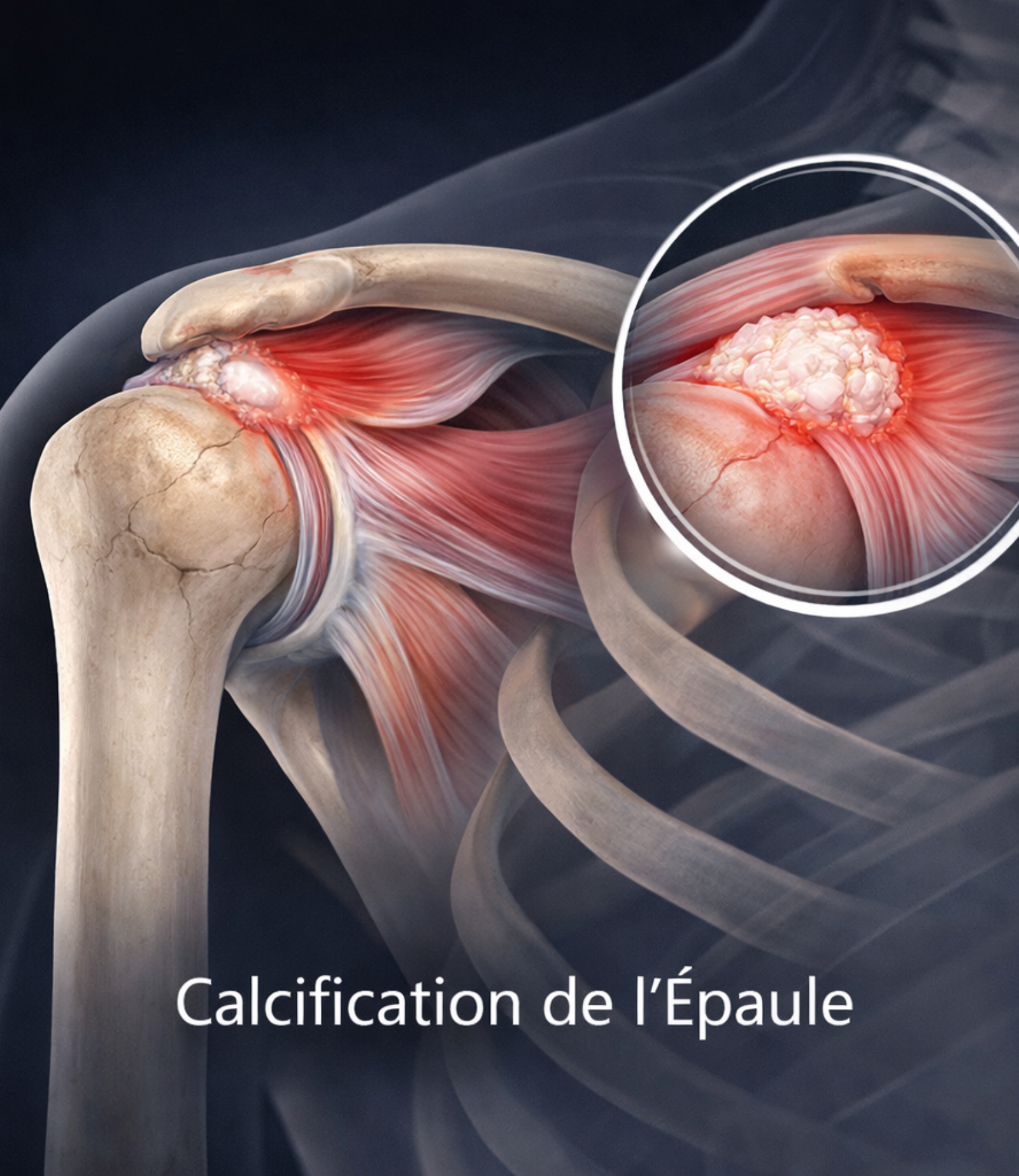 Il s’agit le plus souvent d’une calcification du supra épineux, mais on peut en retrouver sur tous les tendons de la coiffe des rotateurs. Il ne s’agit pas à proprement parler d’une calcification osseuse d'épaule, mais d’un dépôt de cristaux dans un des tendons de la coiffe. On ne connait pas l’origine exacte de ces calcifications d’épaule. Elles ne sont pas liées aux aliments que l’on consomme. Il faut savoir que les calcifications des tendons de l’épaule, finissent toujours par partir toutes seules. Quand elles s’évacuent spontanément, la douleur est extrêmement vive.